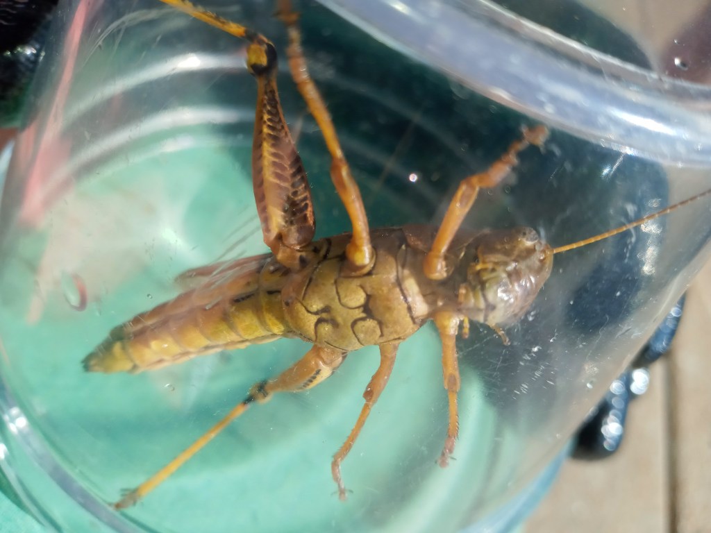 It was one of those gorgeous end-of-summer evenings: cooler weather and the crisp hint of fall in the air. We were heading to Rockwell Beer Garden in Francis Park to meet some friends. I was locking everything up and heading to the car. Judging by the look on my wife’s face, I should have been in the car at least five minutes ago. Despite this, my wife said to me, “Hey, do you want that grasshopper?!” pointing out of the window at the bookshelf we had set out for big trash pick up. As I went about capturing the grasshopper, my wife and kids watched on with slight amusement but mostly a lack of patience as they were ready to meet up with friends and have fun. I placed the grasshopper in its temporary home and we were off. After a night of fun and getting the kids to bed, my wife, being the wonderful hostess that she is, gave our tiny house guest spinach and carrots. That evening, I began thumbing through my books on insects, trying to learn more and figure out what type of grasshopper this was.