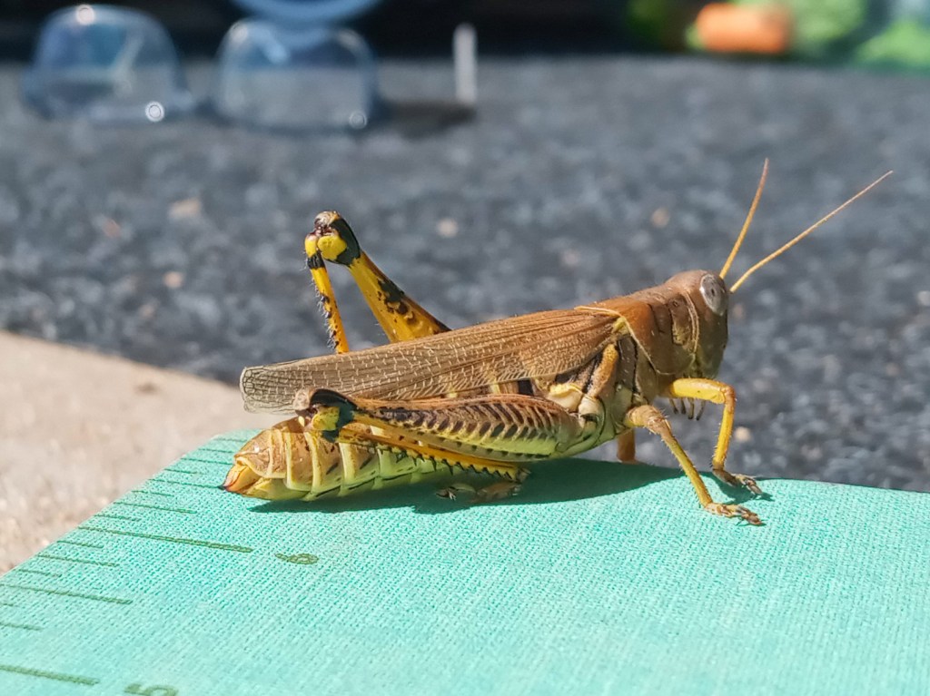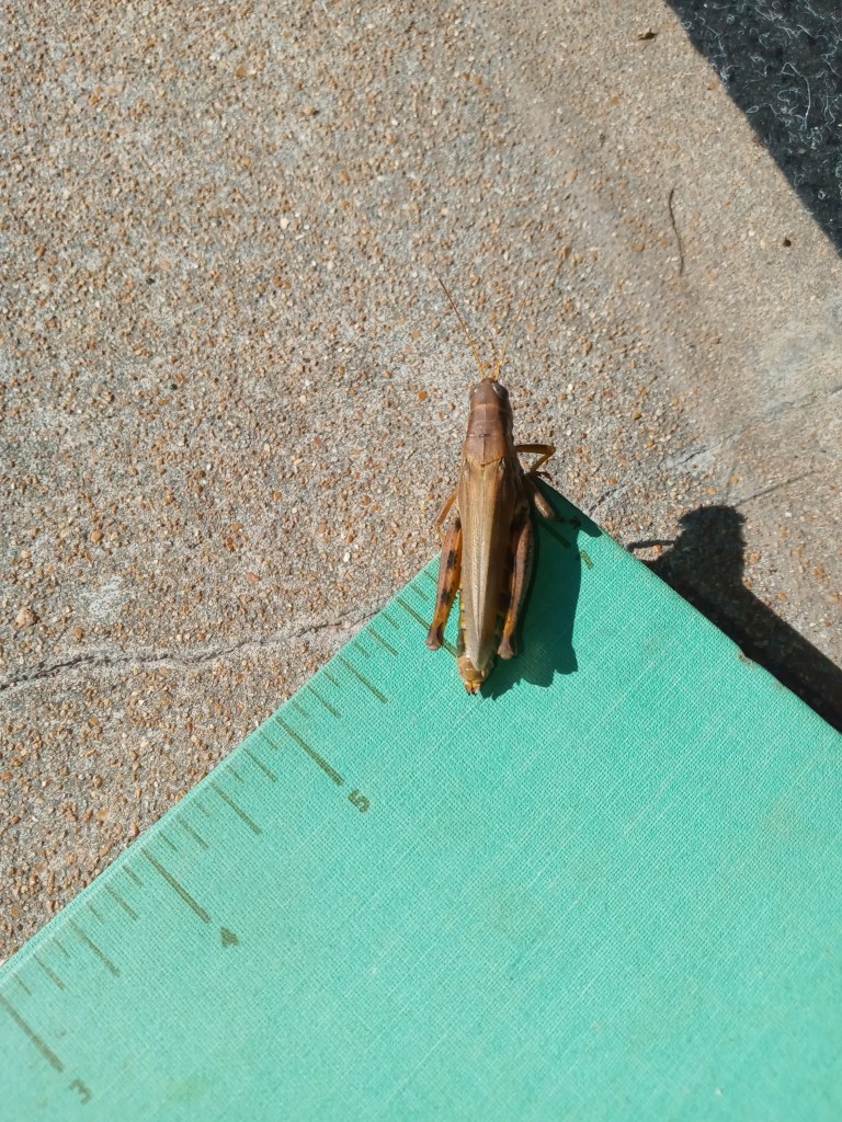 The identification of this species was not as difficult as I assumed it would be. They can reach two inches (our guest attempted to line up on the ruler, he was just shy of the two inch mark) and vary in coloration from brown to green, and occasionally, some are black. They have chevron patterns on their hind femur and don a pair of red antennae. They are short-horned grasshoppers, which means that their antennae are short compared to long-horned grasshoppers whose antennae are longer than the length of their bodies.