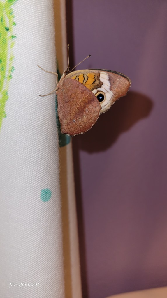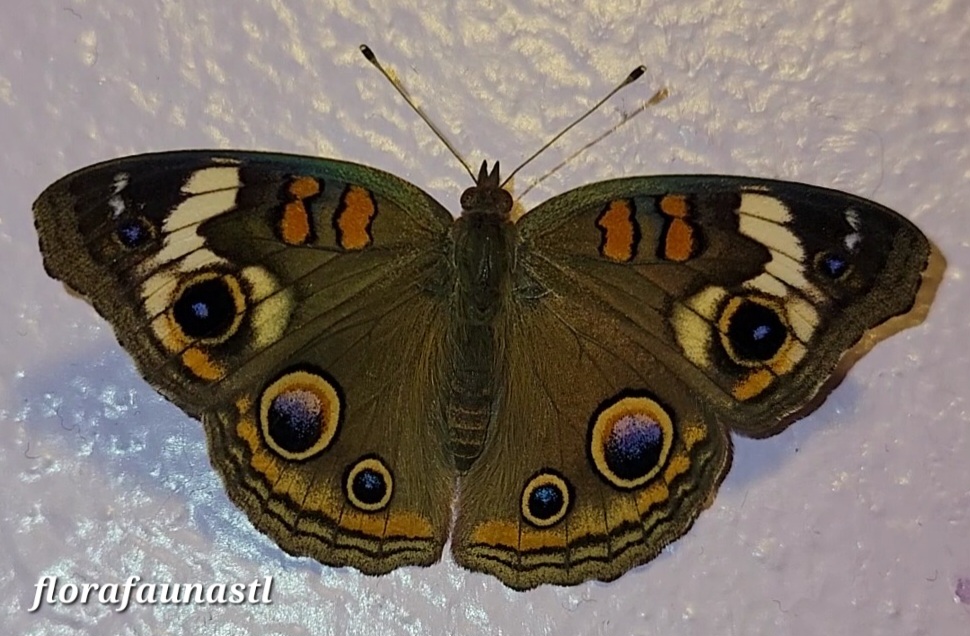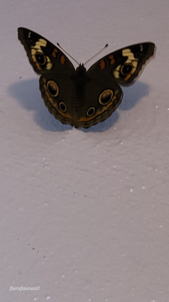 That must have done the trick because the Junonia Coenia, more commonly called the Common Buckeye Butterfly, landed on the wall. My eyes had been spared and left to gaze upon the four stylish orange, purpleish-blue, black, and tan eye spots of this impressive 2 1/2 inch butterfly. The body of the Common Buckeye is mostly brown, with the exception of two dashing orange marks on the forewing and creme white bands as well. The butterfly angrily opened and closed its wings as it sat perched on the wall before making a bold attempt to take my eyes out again, but this time I called its bluff and pulled my phone out of my pocket to get some pictures.