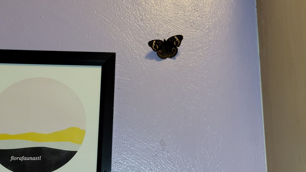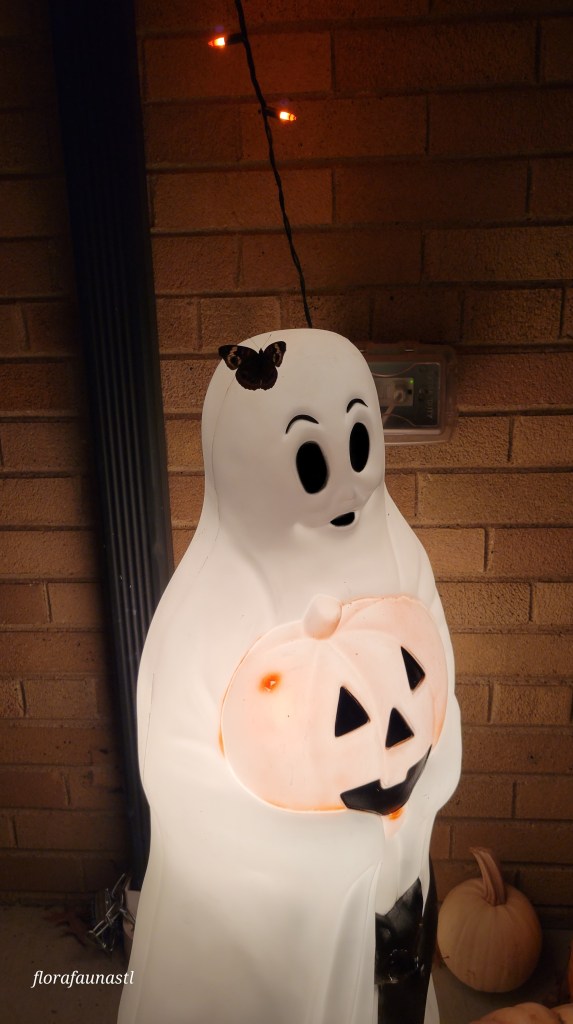 As adults, they face predation from birds and insects and, of course, the race against the cold if they are in the northern parts of the United States. After getting some pictures and video, I was able to convince my rowdy house guest to venture back outside. He fluttered over to the blowmold ghost I inherited from my grandmother and hung there for a while. I am sure the warmth comforted him for a good portion of the night. With the temperatures dropping quickly this year, I presume he never made it back south to warmer weather, but at least he reached adulthood and presumably passed his genes on to a few broods of young Buckeye Butterflies. One can only hope they are not nearly as aggressive as their father. For clarification, these butterflies are harmless and essential pollinators; no one has lost an eye to them…that I know of.