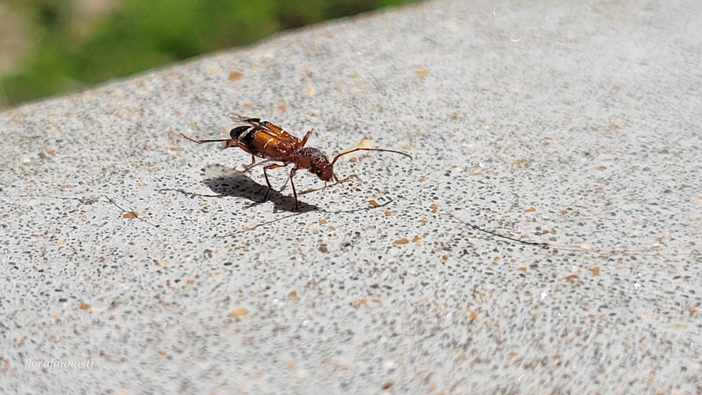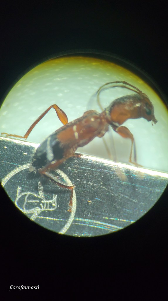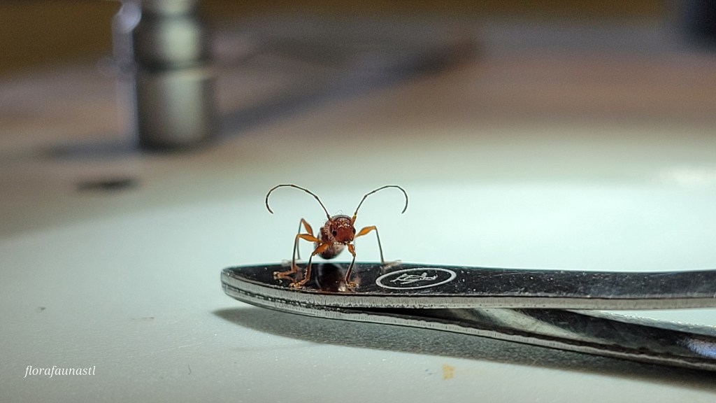 Let’s first examine the innocent, and arguably the cuter of our two examples of ant mimicry. This is Euderces Pini, a small long-horned beetle, measuring a mere 3-9 mm when full grown. This little guy (or girl) is found from the East Coast to Arizona. The larvae are deposited into their host species (elm, oak, etc.) where they burrow into dead or dying trees and mature within the wood. They emerge in early spring and are found as adults until mid-summer. They are often found hanging out on the flowers of aster, honeysuckle, mint, and many other varieties of wild flowering plants. In the case of this specimen, they were found on my car, perhaps convinced they had stumbled upon the largest flower in the world. They are polyphagous, meaning they are able to consume a wide variety of foods including but not limited to; pollen, fungi, bark, vegetables, fruits, decaying foliage, etc. Euderces Pini are Batesian mimics, which means that they mimic ants solely for protection as they do not have any other means of defense. Their body structure and locomotion resemble that of an ant and their antennae are typically held up and curled, again resembling an ant’s antennae. They do have wings but tend to scurry away rather than take flight, playing the part of the ant very well. This Euderces Pini is taking advantage of the ant’s fierce reputation and hoping that it will simply be left alone to eat, procreate, and live in mystery.