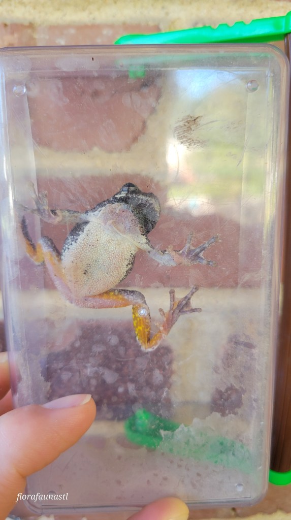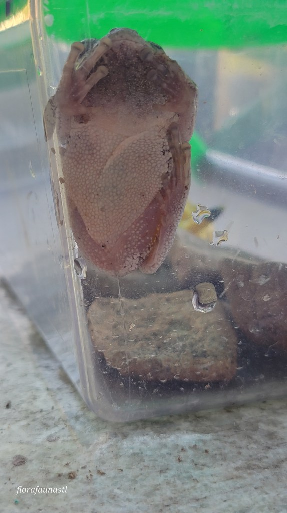 This frog was either Hyla chrysoscelis (Cope’s gray treefrog) or Hyla versicolor (eastern gray treefrog); both species are simply called gray treefrog and their habits and habitats are nearly identical. They range from southeastern Canada to northern Florida and between the Midwest all the way to the east coast. They prefer to be near bodies of water (the Webbs’ pool) and live in a wide array of habitats, including but not limited to: woodlands, hardwood forests, small woodlots, swamps, and backyards. They are known to perch near porch lights and take advantage of the abundance of yummy insects the light attracts. Both species have warty or bumpy skin and possess the ability to climb vertically thanks to adhesive pads on their toes. They actually secrete a type of mucus through their toe pads that helps to create surface tension, which allows them to scale almost any surface with ease. This comes in handy as they spend the bulk of their summer living an arboreal lifestyle.