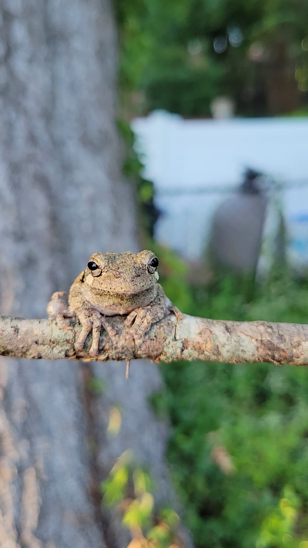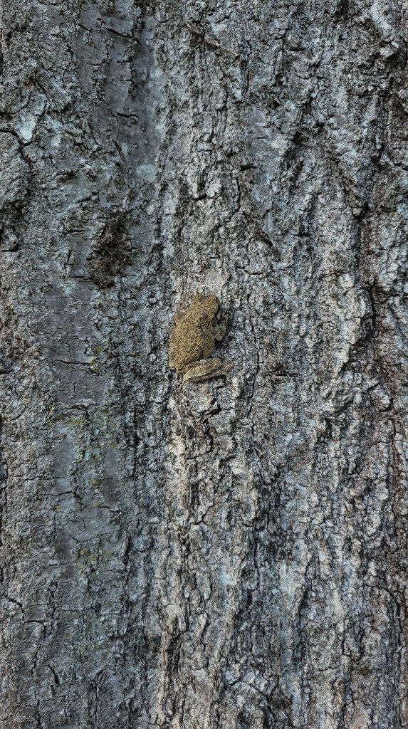 Dave got a container to put the frog in, and the kids gawked at him while asking questions about what he eats, what it is, is it poisonous, and of course “Can we keep him!?” It was one of those magic moments of summer where a stranger (for the kids at least) enters the area and the connection and curiosity with nature intensifies. I fielded a few of their questions and talked about the importance of respecting nature and letting animals live in their natural habitat. We talked about the differences between frogs and toads, and I informed them this was a Gray treefrog. Their curiosity waned after a while, and the allure of the electric-powered kid car and toy golf clubs were once again front and center.