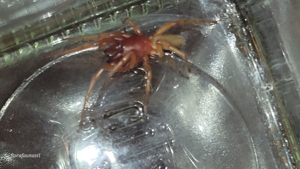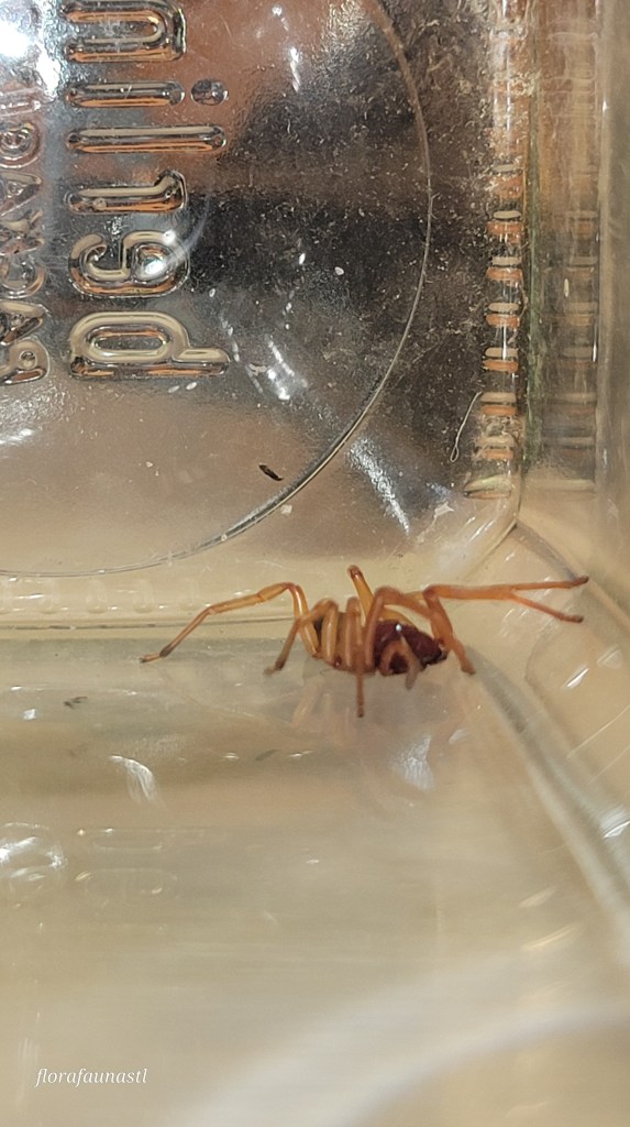 It is official, the wife has boarded the “What is this creature!?” ship! We have embarked on a new chapter in our marriage, one where she is now capturing insects and bringing them to me with an eagerness to learn more about them. Last week she brought up a bright reddish spider from the basement which she found hiding around the laundry basket. One can assume it was judging us for not separating colors while it waited for prey to approach. I was in a work meeting when she handed me the captured spider in a jar, and I knew as soon as I saw the fangs that this was a Woodlouse spider, scientific name Dysdera crocata.