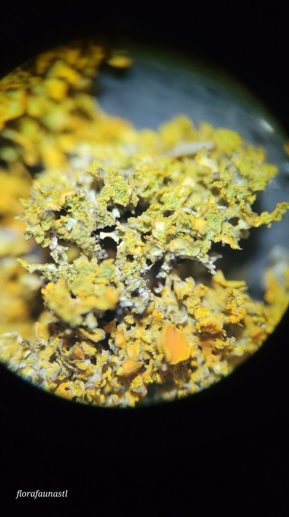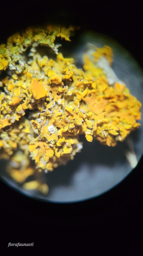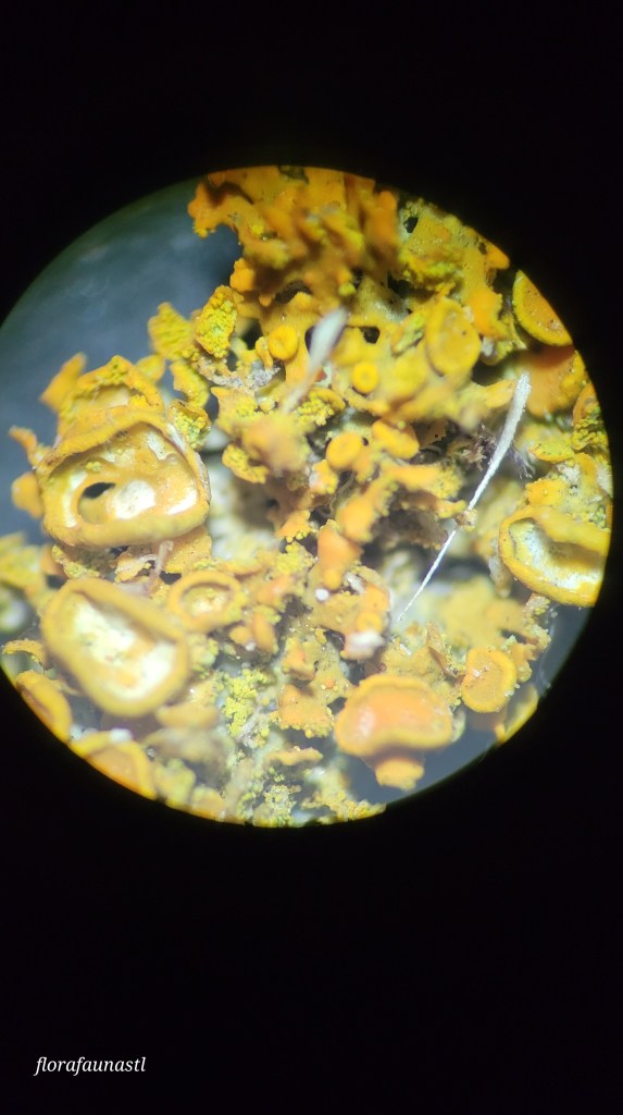 We can also see that the lichen possesses apothecia, which is the cup-shaped structure of the fungus. The apothecia bears the spore sacs which are called asci. These spores, which are created by the fusion of gametes (sperm and ova) inside the tissue of the apothecia, will need to quickly find algae or cyanobacteria to bind to, or they will die off. Keep in mind that even lichen within the same family group do not reproduce the same way; some may use vegetative reproduction, but with the appearance of apothecia, we can deduce that this species of Xanthoria reproduces via spores. There are also a few different ways to define lichen based on how they adhere to their substrate. Those scale-like lichen that adhere very closely to their substrate are called crustaceous; those that adhere less closely and possess more leaf-like structures are called foliose; and lastly, those that branch out and are hang freely are called fruiticose. Xanthoria parietina is a foliage lichen and thus is attached to its substrate more loosely.