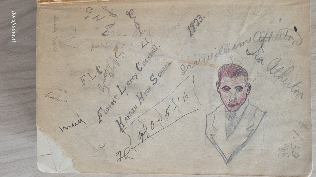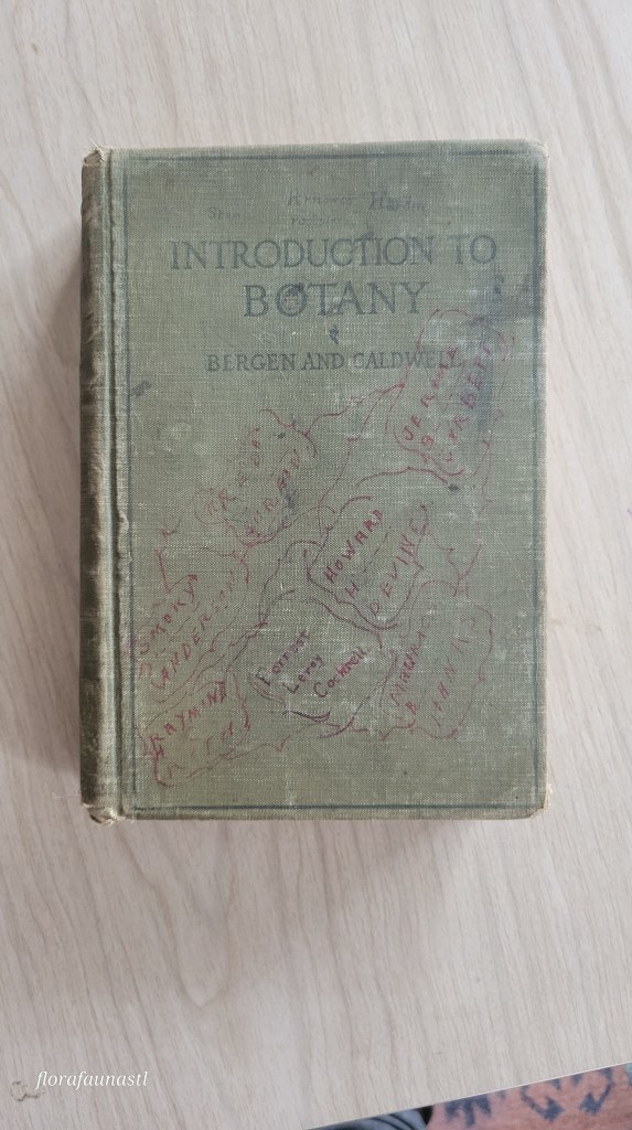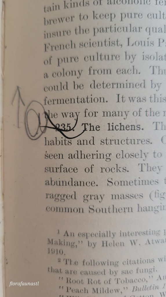I would also like to talk briefly about the help I had with my research from beyond the grave. No, it isn’t a real ghost, but he was a real person. I have an old book from 1914 titled “Introduction To Botany,” and it must have been used in high school. The owner of the book in 1923 was a young man named Forrest Leroy Cockrell, and he attended Hardin High School in Illinois. I came across the book almost a decade ago at Goodwill of all places, and it has been a foundational starting point for much of my botany research. Forrest left notes, drawings, and doodles in the book and even highlighted certain areas; lichens happen to be one of them.