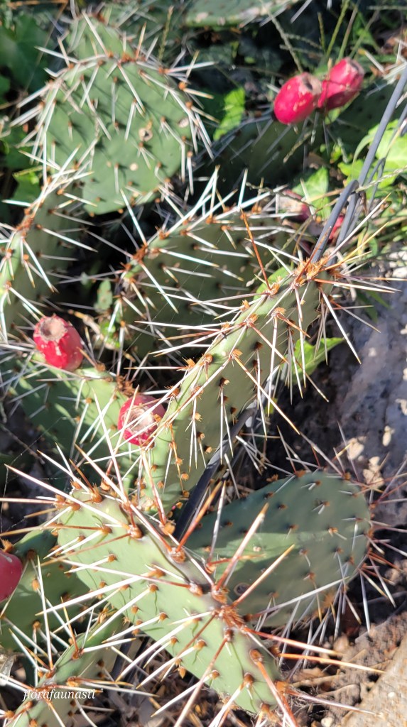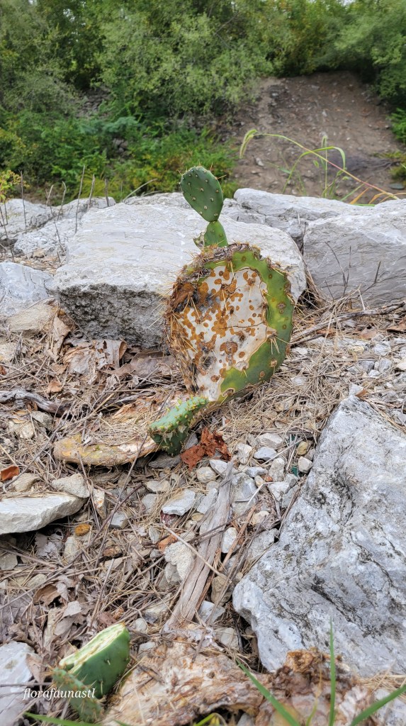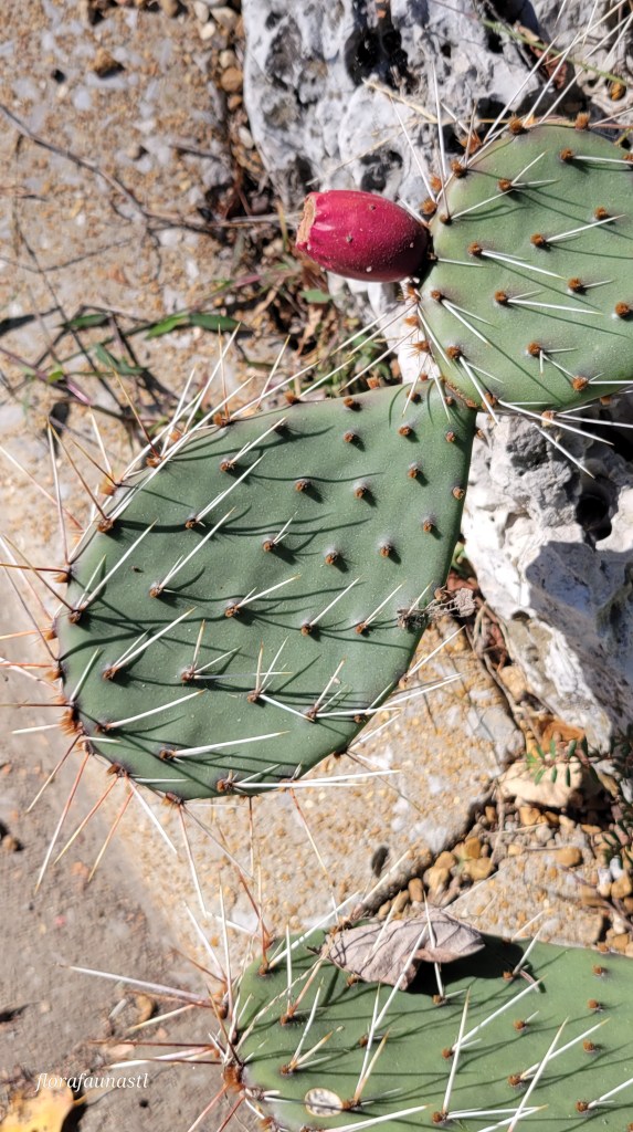 The pear-shaped fruit (which is also called “cactus fig,” “cactus fruit,” and “tuna”) is sweet and used to make jams, drinks, and used in other culinary dishes. The pads are also edible and are often cut open, sliced into thin strips, and fried like green beans. Eating this cactus is not as effortless as it sounds, though. Not only are there spines that need to be removed, but the eastern prickly pear also sports sharp, hair-thin barbed bristles that are very difficult to remove. Having had these bristles stuck in my fingers, I can attest to their annoyance and discomfort. Eastern prickly pear also offers a treat for the eyes and pollinators alike, producing large vibrant yellow flowers with an orange center each spring. I wish I could tell you what these flowers smell like, but putting my face, in particular my eyes, closer and closer to those pointy spines has always been a light deterrent for me. Smell at your own risk with this one, folks! The pictures here are specimens I found in local parks in St. Louis. A few pictures are from our trip to Poplar Bluff, where we went to visit friends and see the eclipse of 2024, and surprisingly, eastern prickly pear. So if you are ever itching for a barefoot walk in the woods, or even some local parks, be cautious of where you step. That said, please go out and explore as there is so much to discover, even in your own backyard!