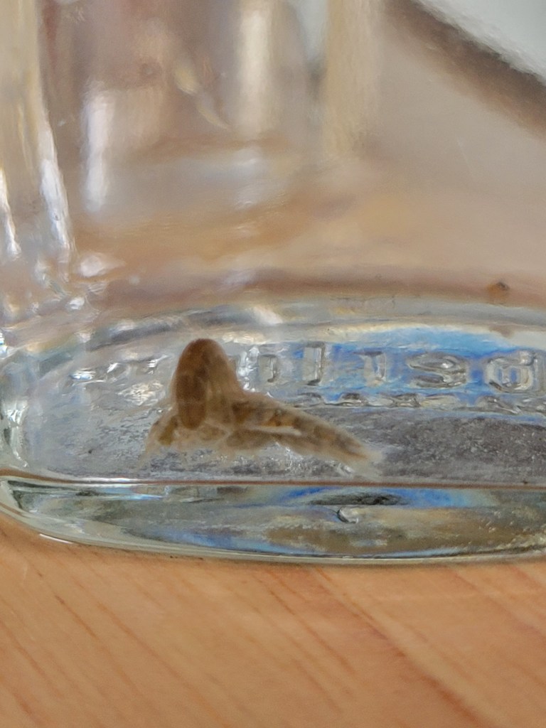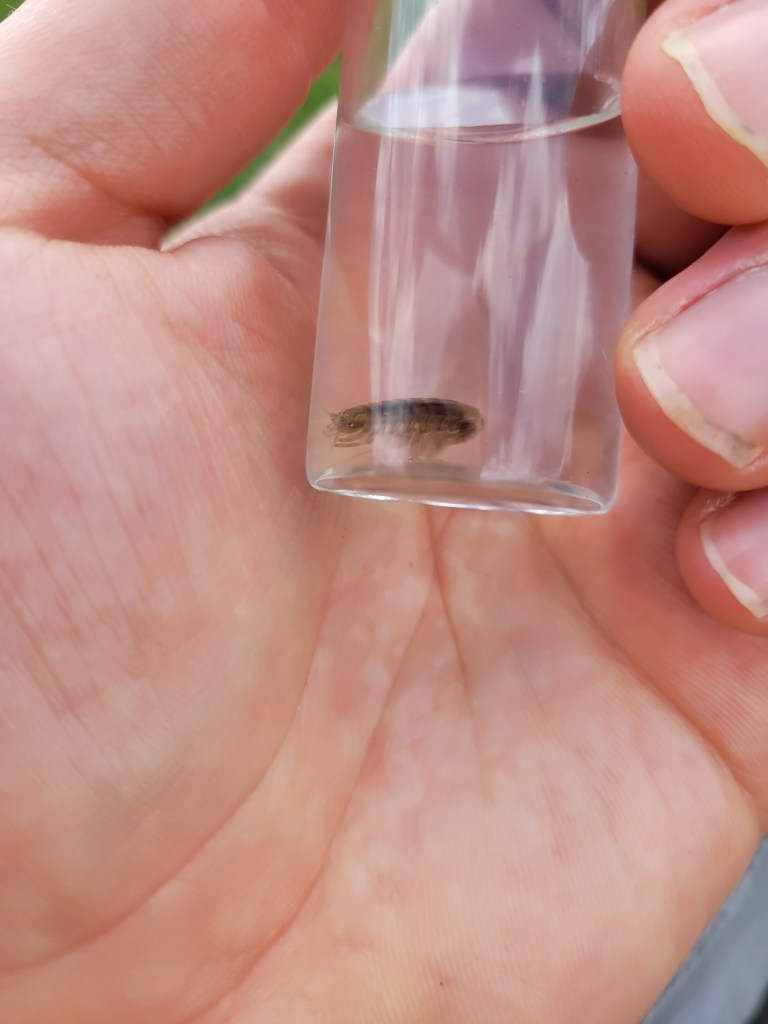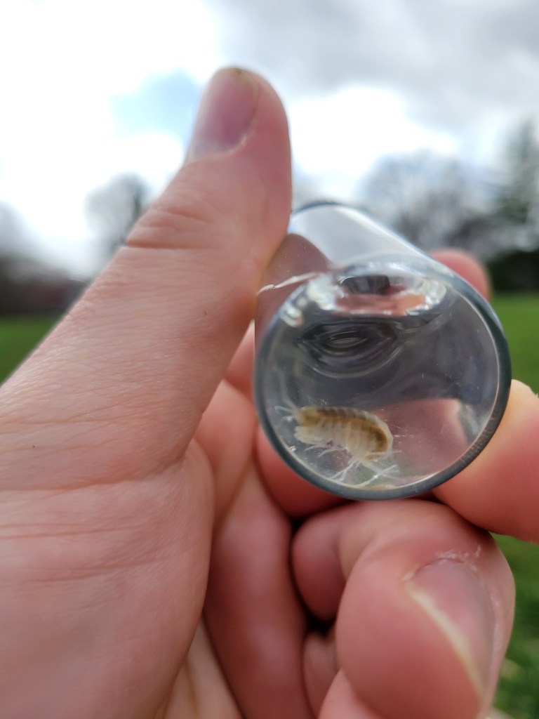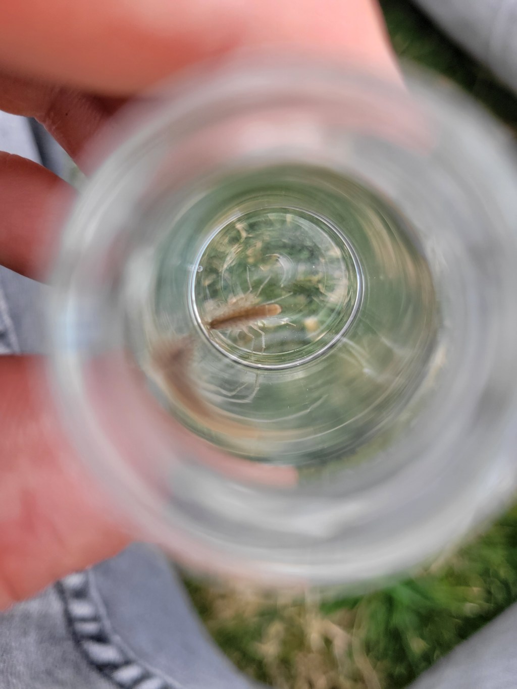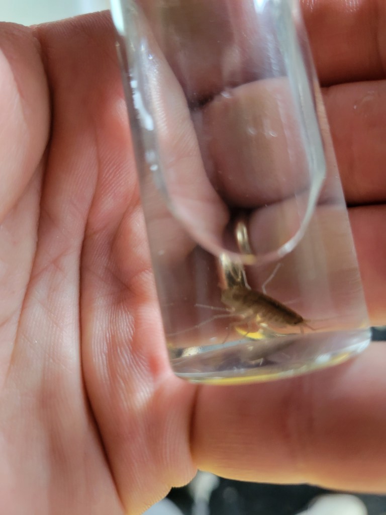 It was in this very spot that my son and I first noticed something very small and noticeably white in coloration come to the surface ever so often before jetting back to the stream bed. This is the creature I came back to find with my trusty fuzzy sidekick. Unfortunately, Biscuit was much more concerned with the sounds of the Northern Flickers in the distance and had her mind set on bird watching, so I was alone in my freshwater spring/stream exploration. With Biscuit secured to a tree near the stream, I approached the muddy banks using a long stick to help prop myself up and stop me from sliding into the water. I had a jar in hand and scoured the water with my eyes looking for any sign of life near the location we first spotted the mystery creature. Perhaps it was an isolated population of Tully’s Monster (Tullimonstrum) that had survived unchanged and undiscovered. Jokes aside, I assumed it was some kind of small aquatic insect, like a dragonfly nymph, although it would be early in the season for that. After about 10 minutes of crouching over the edge of the stream, I finally saw the movement I was looking for, a small pale creature swam to the surface, did a small “flip,” then swam back to the stream bed. Slowly, I placed my jar in the water near where it was resting, and the suction of the water into the jar did the work for me. To my surprise, there were two of them in the jar, one fairly larger than the other.