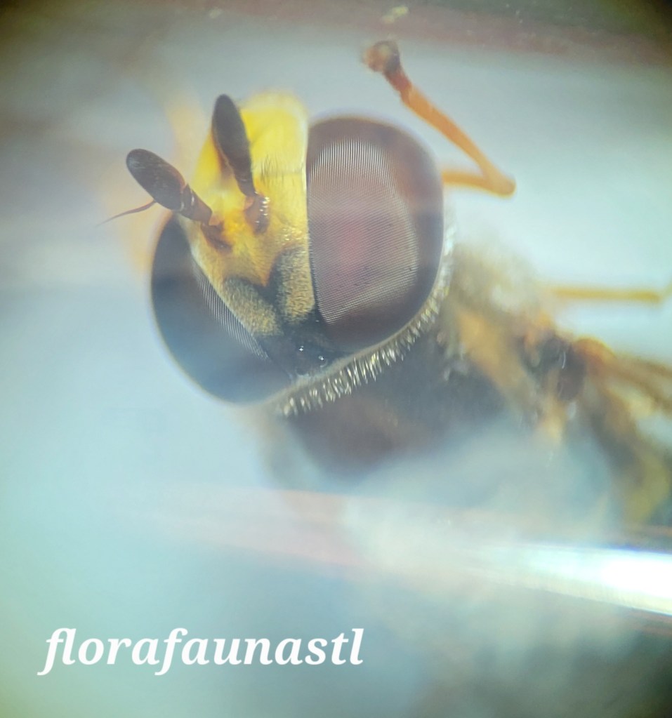 This particular species of hoverfly is either an American Hoverfly (Eupeodes americanus) or a Shot-tailed aphid eater (Eupeodes pomus). Both species inhabit much of the same geographical regions, which for the sake of this website is North America, more specifically St. Louis, Missouri. What I can be certain of is that this particular specimen is a speciwoman…that is to say, this is a female hoverfly. The sexes of these species can be identified by looking at the eyes; males’ eyes will connect or touch whereas the females’ eyes do not touch each other.